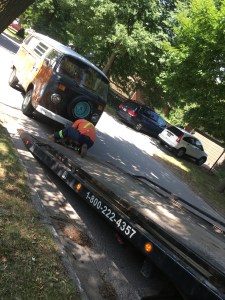 So I rode in the truck all the way up, with the nice tow man who secured Seamus to the truck to keep him steady and secure. It was a long ordeal from start to finish: 4:30-7:30 in total. But Seamus was parked and I opened up all the doors and sat inside working until my ride came to pick me up (Thanks again Ed!). If the shape of the other two buses on the lot there are any indication, Seamus will be running smoothly in no time. Take a look at Seamus’ new friend.