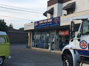 This yellow bus is just like Seamus, but with a different top that appears to be a ‘pop top’. And so at approximately 9:30 pm, I left Seamus in the lot to wait for the shop to open the next day when some skilled VW docs could get up in his business and tell me whats what. Had a great chat meeting with Caleb who works there and has his own relic Beetle Bug.